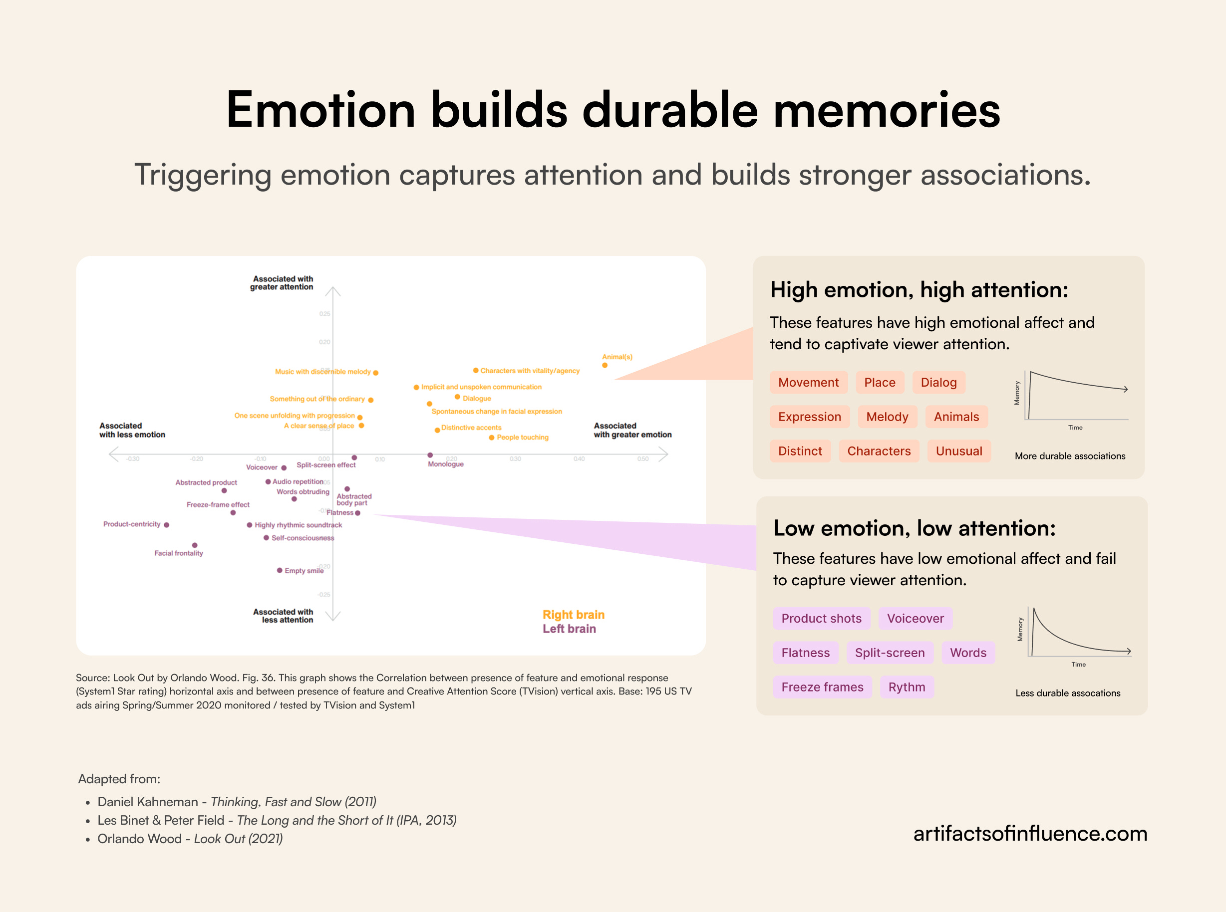 He found that when ads use right-brain features (characters, dialog, melody, movement, expressive people) they’re associated with high emotional affect and sustained attention.